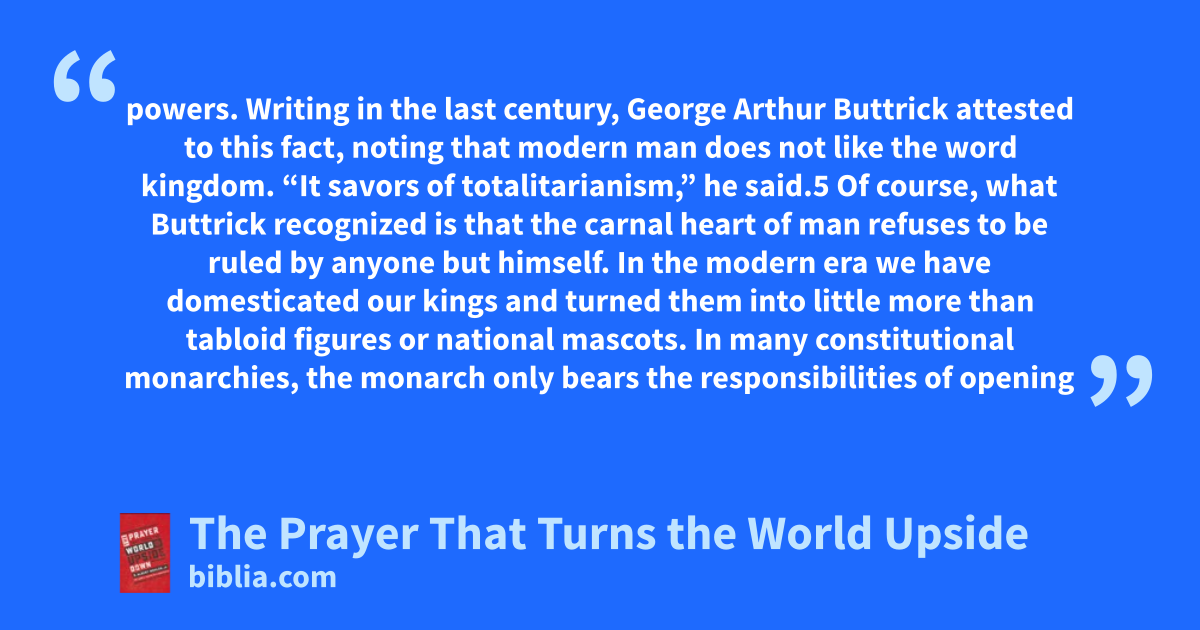 powers. Writing in the last century, George Arthur Buttrick attested to this fact, noting that modern man does not like the word kingdom. “It savors of totalitarianism,” he said.5 Of course, what Buttrick recognized is that the carnal heart of man refuses to be ruled by anyone but himself. In the modern era we have domesticated our kings and turned them into little more than tabloid figures or national mascots. In many constitutional monarchies, the monarch only bears the responsibilities of opening