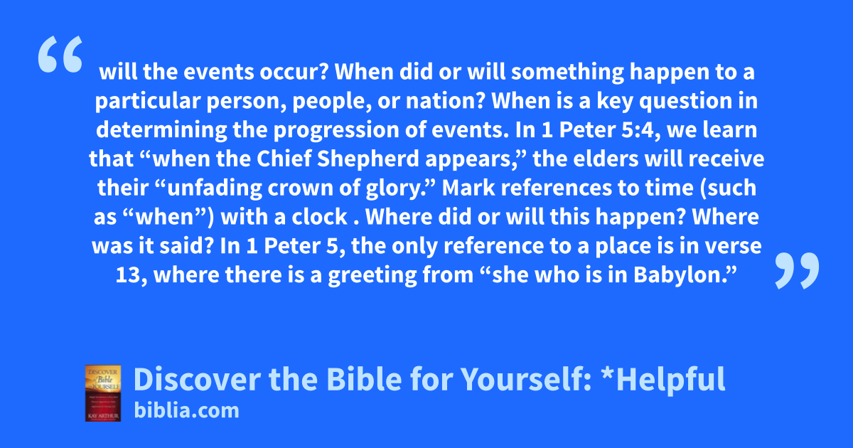 will the events occur? When did or will something happen to a particular person, people, or nation? When is a key question in determining the progression of events. In 1 Peter 5:4, we learn that “when the Chief Shepherd appears,” the elders will receive their “unfading crown of glory.” Mark references to time (such as “when”) with a clock . Where did or will this happen? Where was it said? In 1 Peter 5, the only reference to a place is in verse 13, where there is a greeting from “she who is in Babylon.”