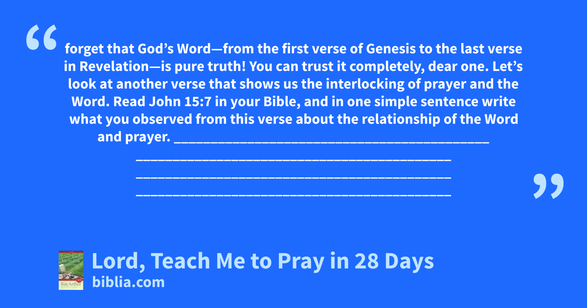 forget that God’s Word—from the first verse of Genesis to the last verse in Revelation—is pure truth! You can trust it completely, dear one. Let’s look at another verse that shows us the interlocking of prayer and the Word. Read John 15:7 in your Bible, and in one simple sentence write what you observed from this verse about the relationship of the Word and prayer. ___________________________________________ ___________________________________________ ___________________________________________ ___________________________________________