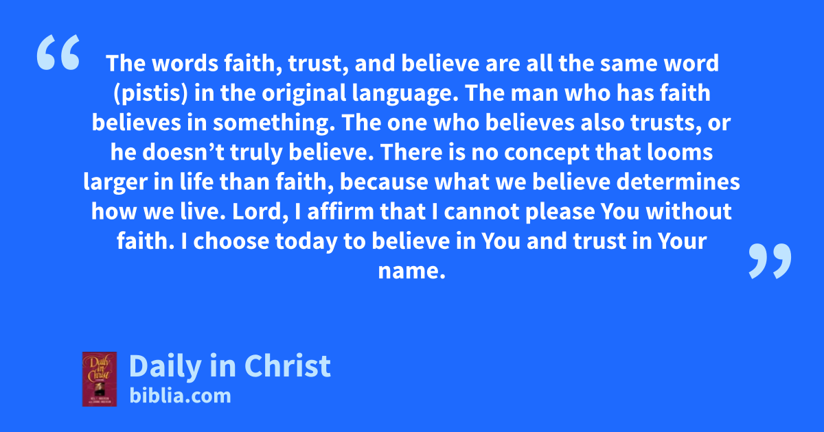 The words faith, trust, and believe are all the same word (pistis) in the original language. The man who has faith believes in something. The one who believes also trusts, or he doesn’t truly believe. There is no concept that looms larger in life than faith, because what we believe determines how we live. Lord, I affirm that I cannot please You without faith. I choose today to believe in You and trust in Your name.