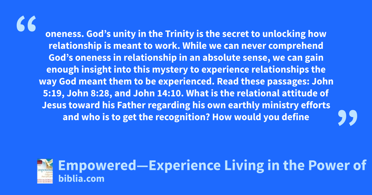 oneness. God’s unity in the Trinity is the secret to unlocking how relationship is meant to work. While we can never comprehend God’s oneness in relationship in an absolute sense, we can gain enough insight into this mystery to experience relationships the way God meant them to be experienced. Read these passages: John 5:19, John 8:28, and John 14:10. What is the relational attitude of Jesus toward his Father regarding his own earthly ministry efforts and who is to get the recognition? How would you define