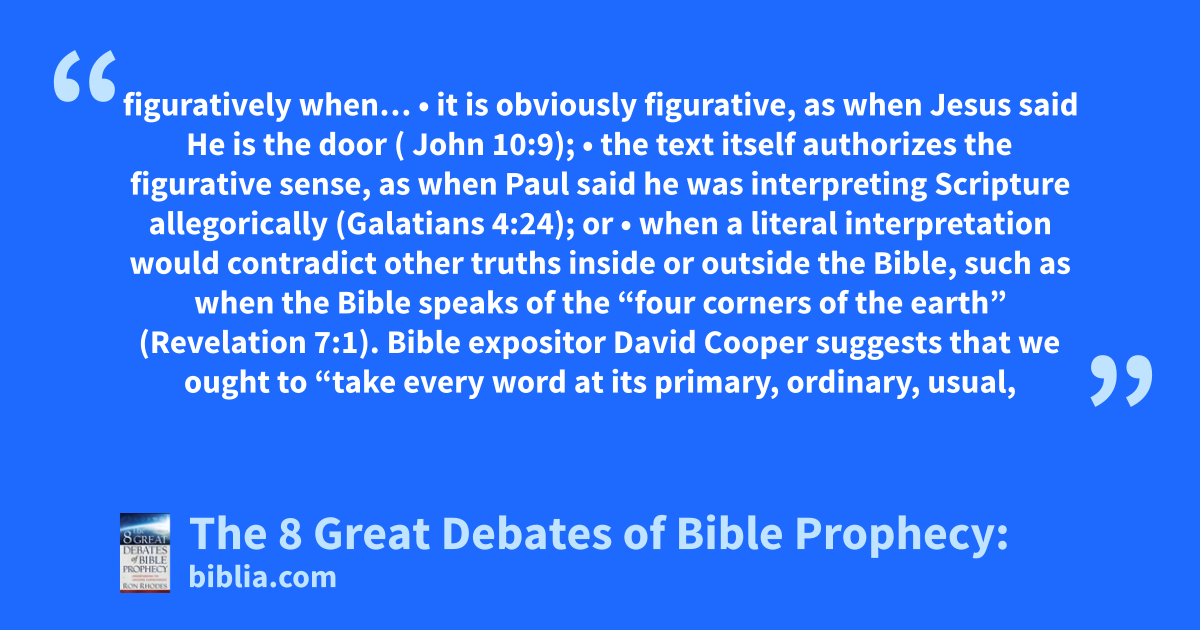 figuratively when… • it is obviously figurative, as when Jesus said He is the door ( John 10:9); • the text itself authorizes the figurative sense, as when Paul said he was interpreting Scripture allegorically (Galatians 4:24); or • when a literal interpretation would contradict other truths inside or outside the Bible, such as when the Bible speaks of the “four corners of the earth” (Revelation 7:1). Bible expositor David Cooper suggests that we ought to “take every word at its primary, ordinary, usual,