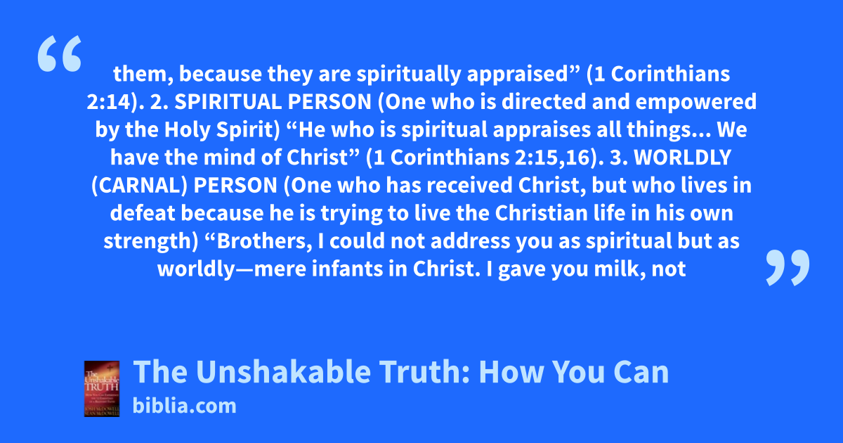 them, because they are spiritually appraised” (1 Corinthians 2:14). 2. SPIRITUAL PERSON (One who is directed and empowered by the Holy Spirit) “He who is spiritual appraises all things... We have the mind of Christ” (1 Corinthians 2:15,16). 3. WORLDLY (CARNAL) PERSON (One who has received Christ, but who lives in defeat because he is trying to live the Christian life in his own strength) “Brothers, I could not address you as spiritual but as worldly—mere infants in Christ. I gave you milk, not