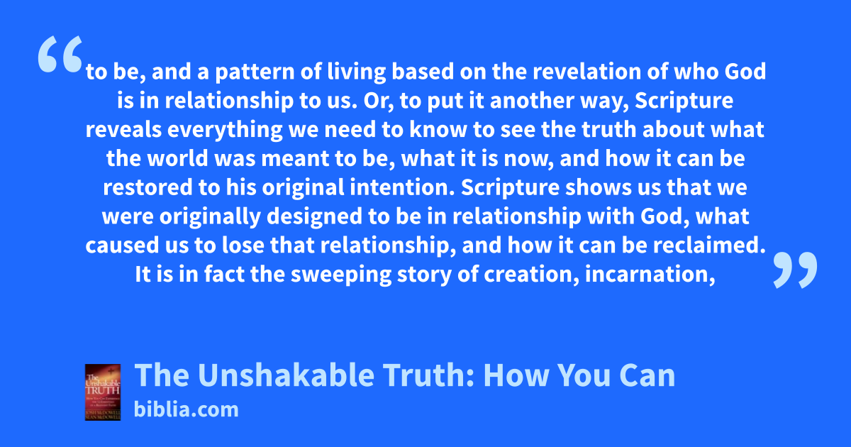 to be, and a pattern of living based on the revelation of who God is in relationship to us. Or, to put it another way, Scripture reveals everything we need to know to see the truth about what the world was meant to be, what it is now, and how it can be restored to his original intention. Scripture shows us that we were originally designed to be in relationship with God, what caused us to lose that relationship, and how it can be reclaimed. It is in fact the sweeping story of creation, incarnation,