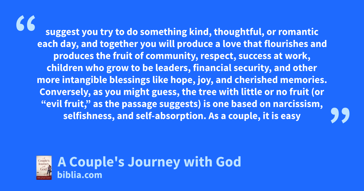 suggest you try to do something kind, thoughtful, or romantic each day, and together you will produce a love that flourishes and produces the fruit of community, respect, success at work, children who grow to be leaders, financial security, and other more intangible blessings like hope, joy, and cherished memories. Conversely, as you might guess, the tree with little or no fruit (or “evil fruit,” as the passage suggests) is one based on narcissism, selfishness, and self-absorption. As a couple, it is easy