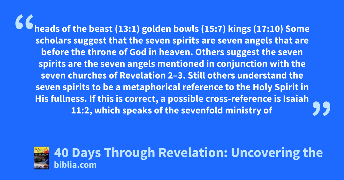 heads of the beast (13:1) golden bowls (15:7) kings (17:10) Some scholars suggest that the seven spirits are seven angels that are before the throne of God in heaven. Others suggest the seven spirits are the seven angels mentioned in conjunction with the seven churches of Revelation 2–3. Still others understand the seven spirits to be a metaphorical reference to the Holy Spirit in His fullness. If this is correct, a possible cross-reference is Isaiah 11:2, which speaks of the sevenfold ministry of