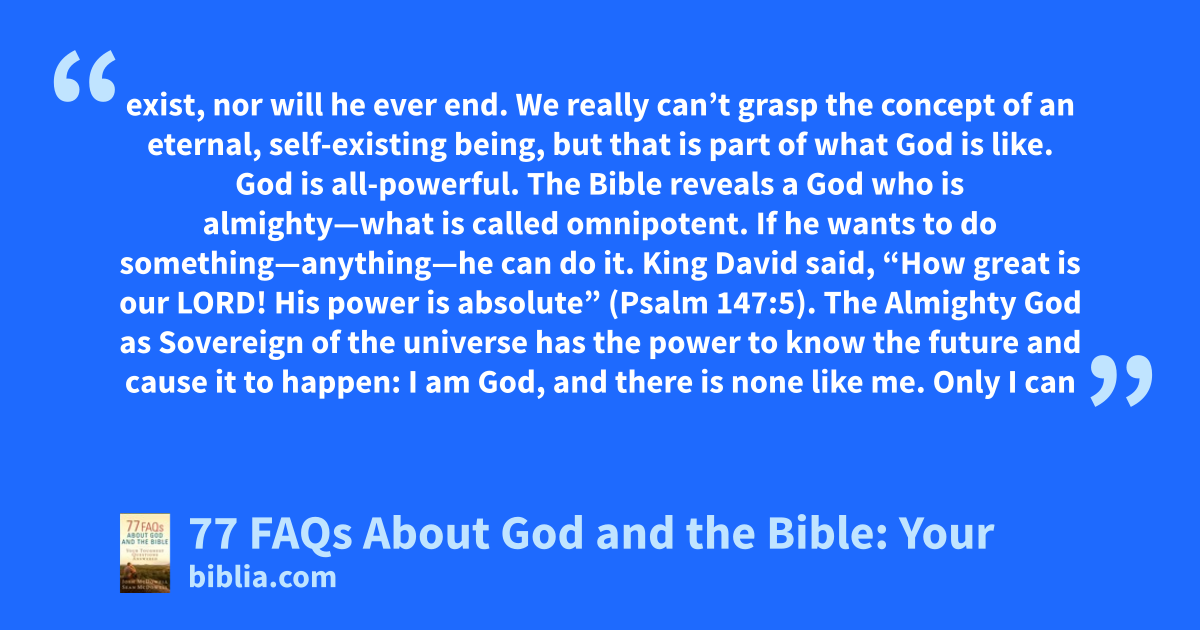 exist, nor will he ever end. We really can’t grasp the concept of an eternal, self-existing being, but that is part of what God is like. God is all-powerful. The Bible reveals a God who is almighty—what is called omnipotent. If he wants to do something—anything—he can do it. King David said, “How great is our LORD! His power is absolute” (Psalm 147:5). The Almighty God as Sovereign of the universe has the power to know the future and cause it to happen: I am God, and there is none like me. Only I can