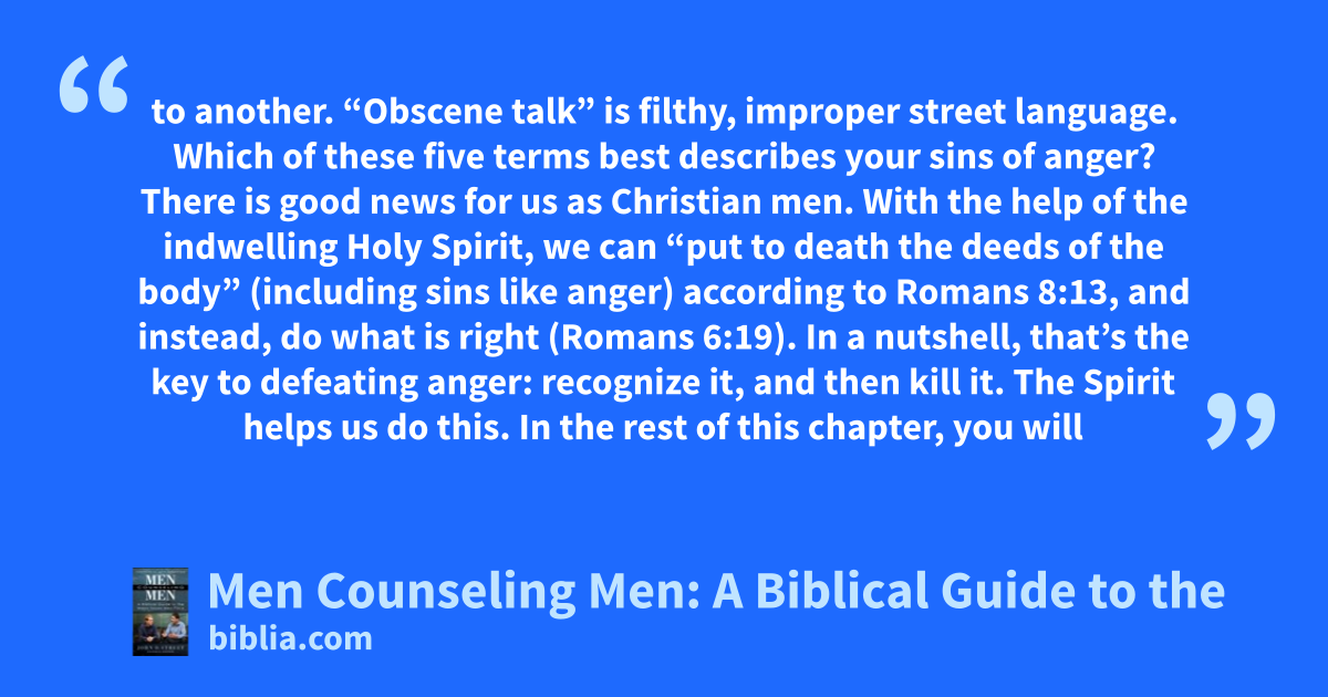 to another. “Obscene talk” is filthy, improper street language. Which of these five terms best describes your sins of anger? There is good news for us as Christian men. With the help of the indwelling Holy Spirit, we can “put to death the deeds of the body” (including sins like anger) according to Romans 8:13, and instead, do what is right (Romans 6:19). In a nutshell, that’s the key to defeating anger: recognize it, and then kill it. The Spirit helps us do this. In the rest of this chapter, you will