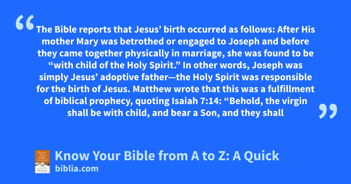 The Bible reports that Jesus’ birth occurred as follows: After His mother Mary was betrothed or engaged to Joseph and before they came together physically in marriage, she was found to be “with child of the Holy Spirit.” In other words, Joseph was simply Jesus’ adoptive father—the Holy Spirit was responsible for the birth of Jesus. Matthew wrote that this was a fulfillment of biblical prophecy, quoting Isaiah 7:14: “Behold, the virgin shall be with child, and bear a Son, and they shall
