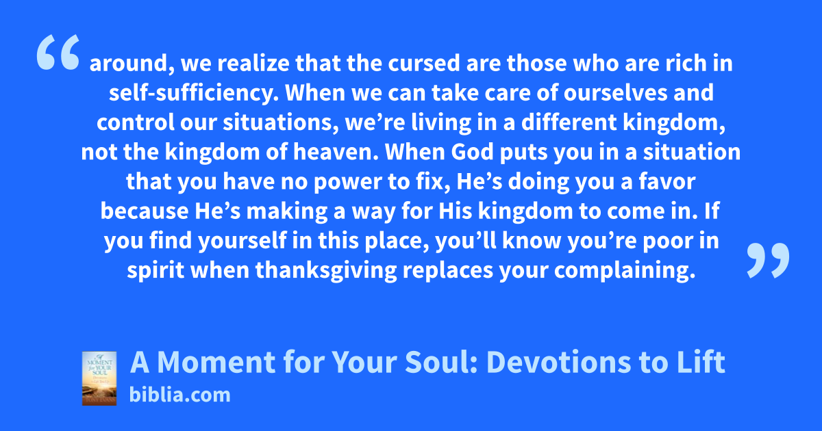 around, we realize that the cursed are those who are rich in self-sufficiency. When we can take care of ourselves and control our situations, we’re living in a different kingdom, not the kingdom of heaven. When God puts you in a situation that you have no power to fix, He’s doing you a favor because He’s making a way for His kingdom to come in. If you find yourself in this place, you’ll know you’re poor in spirit when thanksgiving replaces your complaining.
