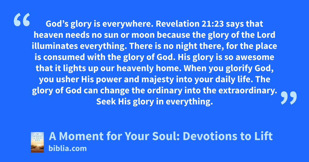 God’s glory is everywhere. Revelation 21:23 says that heaven needs no sun or moon because the glory of the Lord illuminates everything. There is no night there, for the place is consumed with the glory of God. His glory is so awesome that it lights up our heavenly home. When you glorify God, you usher His power and majesty into your daily life. The glory of God can change the ordinary into the extraordinary. Seek His glory in everything.