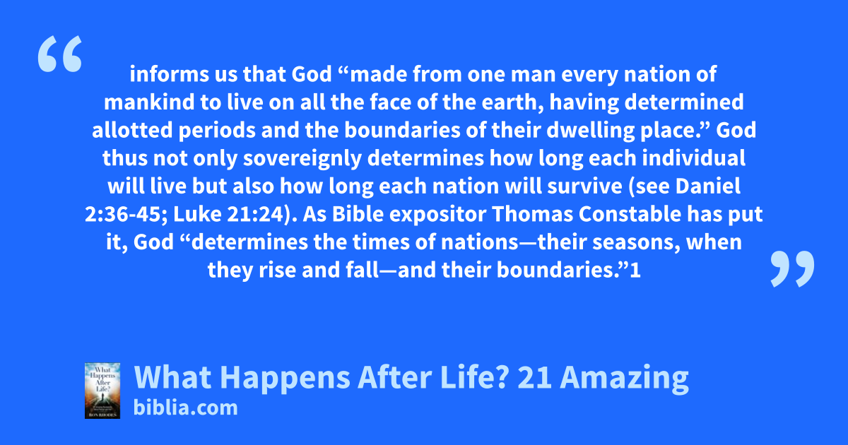 informs us that God “made from one man every nation of mankind to live on all the face of the earth, having determined allotted periods and the boundaries of their dwelling place.” God thus not only sovereignly determines how long each individual will live but also how long each nation will survive (see Daniel 2:36-45; Luke 21:24). As Bible expositor Thomas Constable has put it, God “determines the times of nations—their seasons, when they rise and fall—and their boundaries.”1
