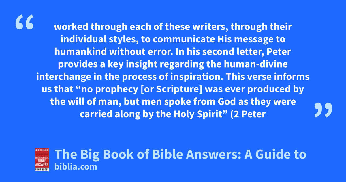 worked through each of these writers, through their individual styles, to communicate His message to humankind without error. In his second letter, Peter provides a key insight regarding the human-divine interchange in the process of inspiration. This verse informs us that “no prophecy [or Scripture] was ever produced by the will of man, but men spoke from God as they were carried along by the Holy Spirit” (2 Peter