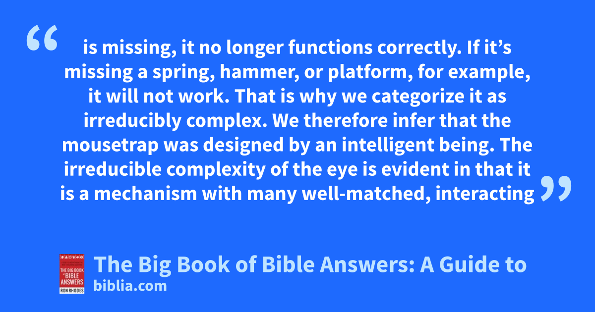 is missing, it no longer functions correctly. If it’s missing a spring, hammer, or platform, for example, it will not work. That is why we categorize it as irreducibly complex. We therefore infer that the mousetrap was designed by an intelligent being. The irreducible complexity of the eye is evident in that it is a mechanism with many well-matched, interacting