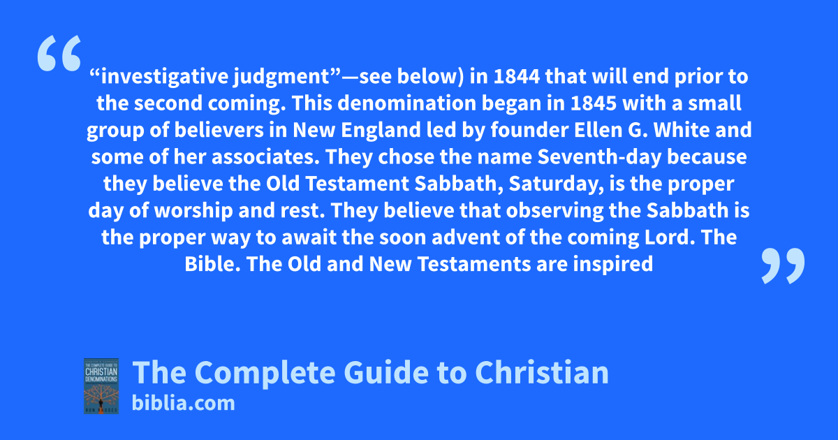 “investigative judgment”—see below) in 1844 that will end prior to the second coming. This denomination began in 1845 with a small group of believers in New England led by founder Ellen G. White and some of her associates. They chose the name Seventh-day because they believe the Old Testament Sabbath, Saturday, is the proper day of worship and rest. They believe that observing the Sabbath is the proper way to await the soon advent of the coming Lord. The Bible. The Old and New Testaments are inspired