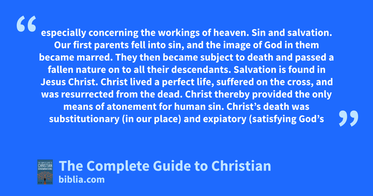 especially concerning the workings of heaven. Sin and salvation. Our first parents fell into sin, and the image of God in them became marred. They then became subject to death and passed a fallen nature on to all their descendants. Salvation is found in Jesus Christ. Christ lived a perfect life, suffered on the cross, and was resurrected from the dead. Christ thereby provided the only means of atonement for human sin. Christ’s death was substitutionary (in our place) and expiatory (satisfying God’s