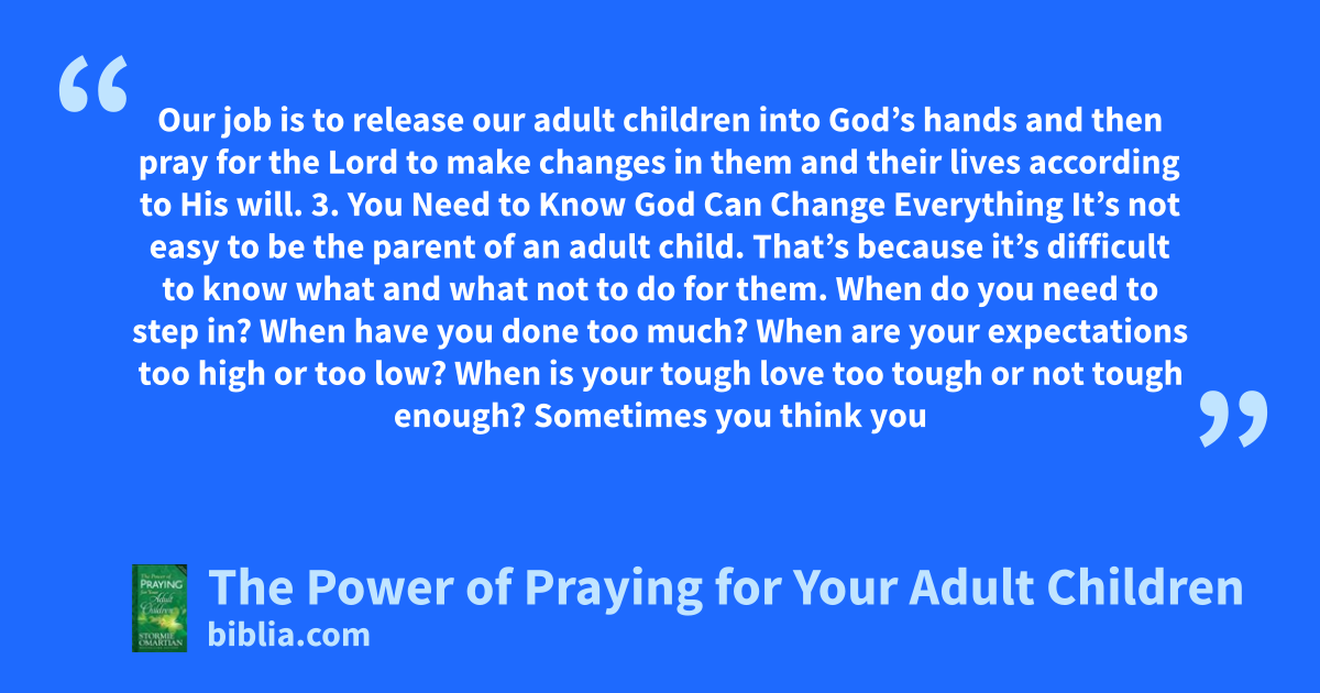 Our job is to release our adult children into God’s hands and then pray for the Lord to make changes in them and their lives according to His will. 3. You Need to Know God Can Change Everything It’s not easy to be the parent of an adult child. That’s because it’s difficult to know what and what not to do for them. When do you need to step in? When have you done too much? When are your expectations too high or too low? When is your tough love too tough or not tough enough? Sometimes you think you