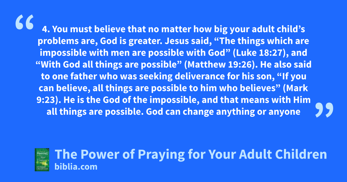 4. You must believe that no matter how big your adult child’s problems are, God is greater. Jesus said, “The things which are impossible with men are possible with God” (Luke 18:27), and “With God all things are possible” (Matthew 19:26). He also said to one father who was seeking deliverance for his son, “If you can believe, all things are possible to him who believes” (Mark 9:23). He is the God of the impossible, and that means with Him all things are possible. God can change anything or anyone