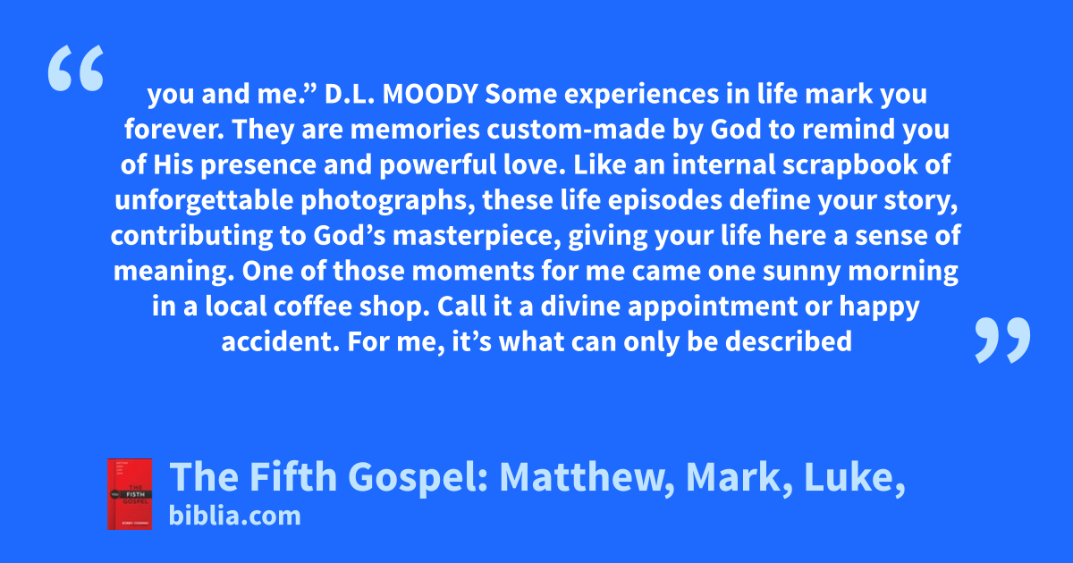 you and me.” D.L. MOODY Some experiences in life mark you forever. They are memories custom-made by God to remind you of His presence and powerful love. Like an internal scrapbook of unforgettable photographs, these life episodes define your story, contributing to God’s masterpiece, giving your life here a sense of meaning. One of those moments for me came one sunny morning in a local coffee shop. Call it a divine appointment or happy accident. For me, it’s what can only be described
