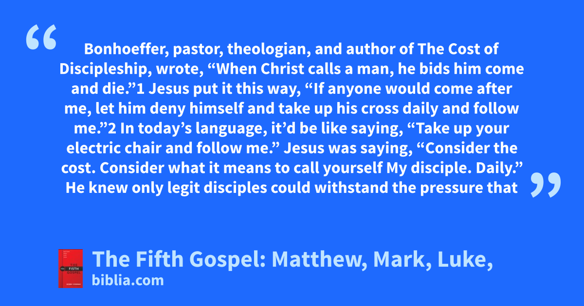 Bonhoeffer, pastor, theologian, and author of The Cost of Discipleship, wrote, “When Christ calls a man, he bids him come and die.”1 Jesus put it this way, “If anyone would come after me, let him deny himself and take up his cross daily and follow me.”2 In today’s language, it’d be like saying, “Take up your electric chair and follow me.” Jesus was saying, “Consider the cost. Consider what it means to call yourself My disciple. Daily.” He knew only legit disciples could withstand the pressure that
