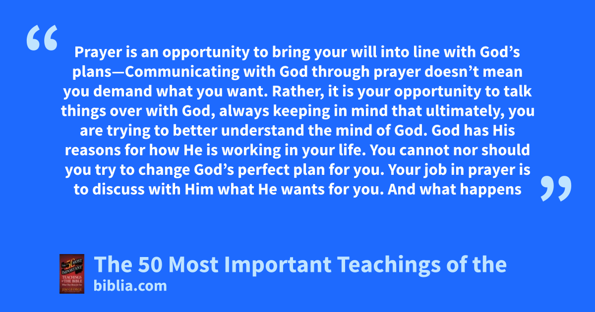 Prayer is an opportunity to bring your will into line with God’s plans—Communicating with God through prayer doesn’t mean you demand what you want. Rather, it is your opportunity to talk things over with God, always keeping in mind that ultimately, you are trying to better understand the mind of God. God has His reasons for how He is working in your life. You cannot nor should you try to change God’s perfect plan for you. Your job in prayer is to discuss with Him what He wants for you. And what happens
