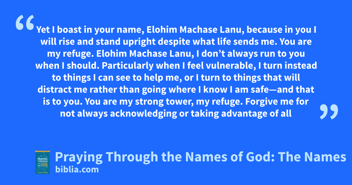 Yet I boast in your name, Elohim Machase Lanu, because in you I will rise and stand upright despite what life sends me. You are my refuge. Elohim Machase Lanu, I don’t always run to you when I should. Particularly when I feel vulnerable, I turn instead to things I can see to help me, or I turn to things that will distract me rather than going where I know I am safe—and that is to you. You are my strong tower, my refuge. Forgive me for not always acknowledging or taking advantage of all