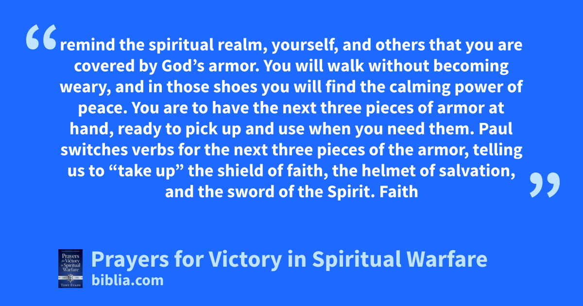 remind the spiritual realm, yourself, and others that you are covered by God’s armor. You will walk without becoming weary, and in those shoes you will find the calming power of peace. You are to have the next three pieces of armor at hand, ready to pick up and use when you need them. Paul switches verbs for the next three pieces of the armor, telling us to “take up” the shield of faith, the helmet of salvation, and the sword of the Spirit. Faith