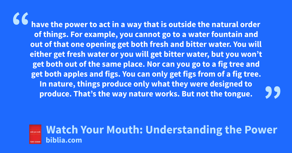 have the power to act in a way that is outside the natural order of things. For example, you cannot go to a water fountain and out of that one opening get both fresh and bitter water. You will either get fresh water or you will get bitter water, but you won’t get both out of the same place. Nor can you go to a fig tree and get both apples and figs. You can only get figs from of a fig tree. In nature, things produce only what they were designed to produce. That’s the way nature works. But not the tongue.