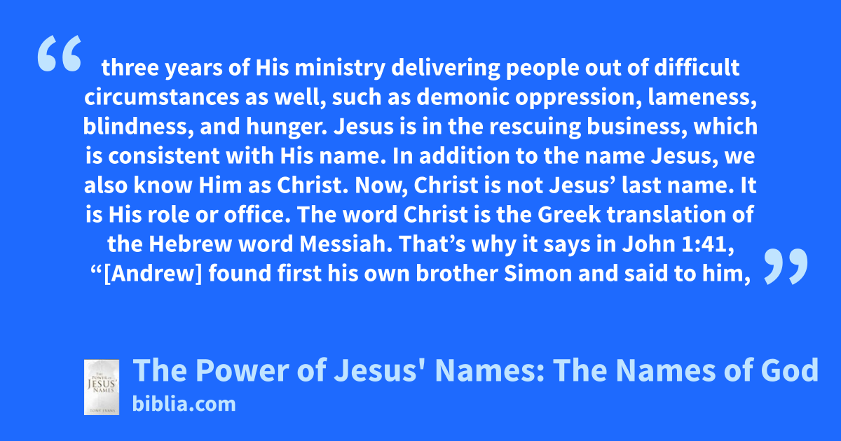 three years of His ministry delivering people out of difficult circumstances as well, such as demonic oppression, lameness, blindness, and hunger. Jesus is in the rescuing business, which is consistent with His name. In addition to the name Jesus, we also know Him as Christ. Now, Christ is not Jesus’ last name. It is His role or office. The word Christ is the Greek translation of the Hebrew word Messiah. That’s why it says in John 1:41, “[Andrew] found first his own brother Simon and said to him,