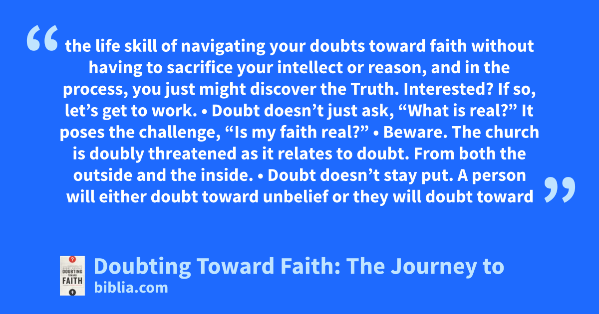 the life skill of navigating your doubts toward faith without having to sacrifice your intellect or reason, and in the process, you just might discover the Truth. Interested? If so, let’s get to work. • Doubt doesn’t just ask, “What is real?” It poses the challenge, “Is my faith real?” • Beware. The church is doubly threatened as it relates to doubt. From both the outside and the inside. • Doubt doesn’t stay put. A person will either doubt toward unbelief or they will doubt toward