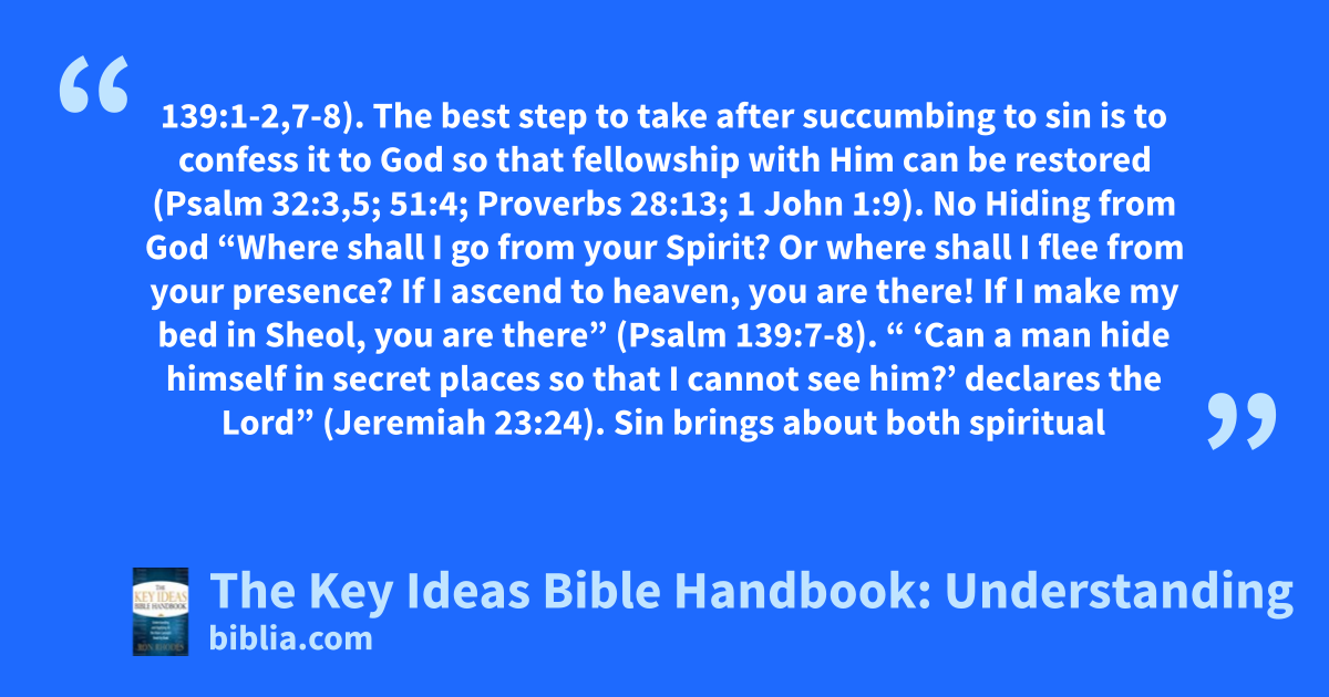 139:1-2,7-8). The best step to take after succumbing to sin is to confess it to God so that fellowship with Him can be restored (Psalm 32:3,5; 51:4; Proverbs 28:13; 1 John 1:9). No Hiding from God “Where shall I go from your Spirit? Or where shall I flee from your presence? If I ascend to heaven, you are there! If I make my bed in Sheol, you are there” (Psalm 139:7-8). “ ‘Can a man hide himself in secret places so that I cannot see him?’ declares the Lord” (Jeremiah 23:24). Sin brings about both spiritual