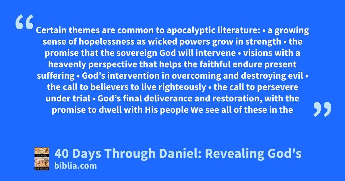 Certain themes are common to apocalyptic literature: • a growing sense of hopelessness as wicked powers grow in strength • the promise that the sovereign God will intervene • visions with a heavenly perspective that helps the faithful endure present suffering • God’s intervention in overcoming and destroying evil • the call to believers to live righteously • the call to persevere under trial • God’s final deliverance and restoration, with the promise to dwell with His people We see all of these in the