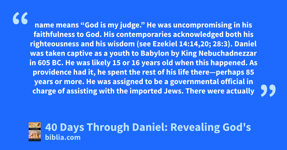 name means “God is my judge.” He was uncompromising in his faithfulness to God. His contemporaries acknowledged both his righteousness and his wisdom (see Ezekiel 14:14,20; 28:3). Daniel was taken captive as a youth to Babylon by King Nebuchadnezzar in 605 BC. He was likely 15 or 16 years old when this happened. As providence had it, he spent the rest of his life there—perhaps 85 years or more. He was assigned to be a governmental official in charge of assisting with the imported Jews. There were actually