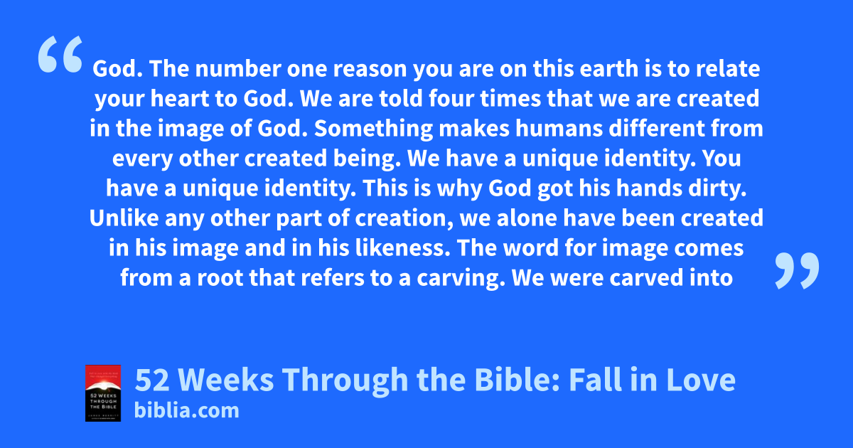 God. The number one reason you are on this earth is to relate your heart to God. We are told four times that we are created in the image of God. Something makes humans different from every other created being. We have a unique identity. You have a unique identity. This is why God got his hands dirty. Unlike any other part of creation, we alone have been created in his image and in his likeness. The word for image comes from a root that refers to a carving. We were carved into