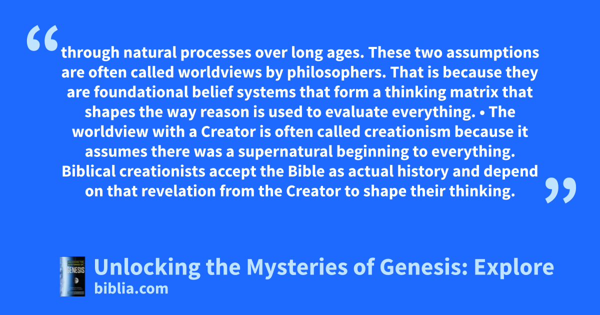 through natural processes over long ages. These two assumptions are often called worldviews by philosophers. That is because they are foundational belief systems that form a thinking matrix that shapes the way reason is used to evaluate everything. • The worldview with a Creator is often called creationism because it assumes there was a supernatural beginning to everything. Biblical creationists accept the Bible as actual history and depend on that revelation from the Creator to shape their thinking.