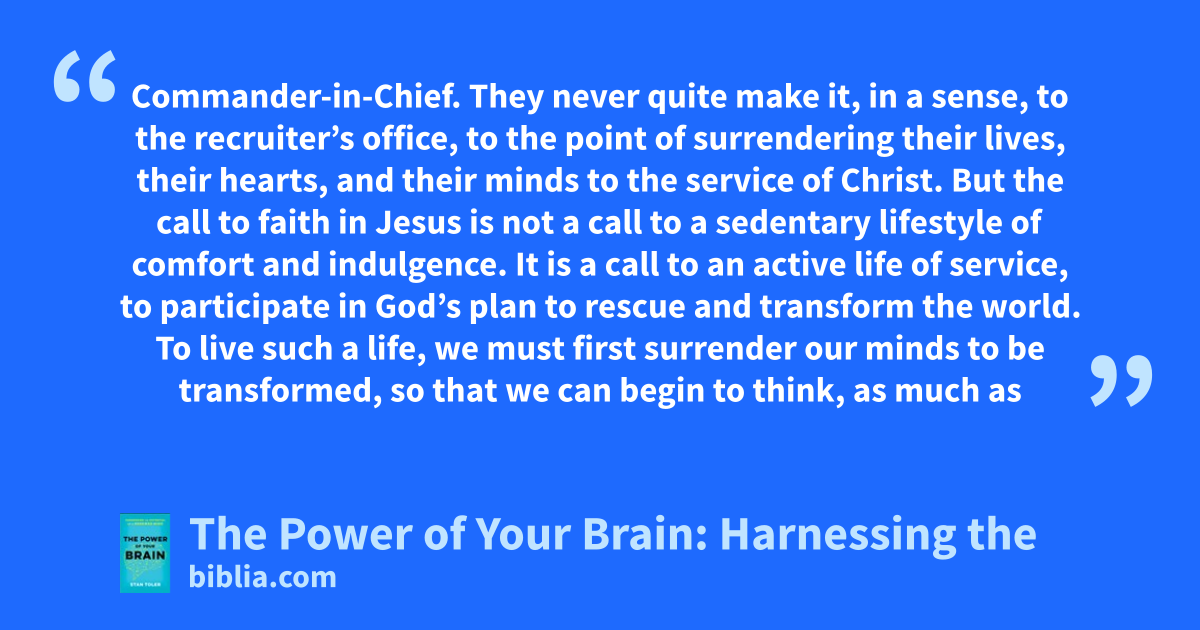 Commander-in-Chief. They never quite make it, in a sense, to the recruiter’s office, to the point of surrendering their lives, their hearts, and their minds to the service of Christ. But the call to faith in Jesus is not a call to a sedentary lifestyle of comfort and indulgence. It is a call to an active life of service, to participate in God’s plan to rescue and transform the world. To live such a life, we must first surrender our minds to be transformed, so that we can begin to think, as much as