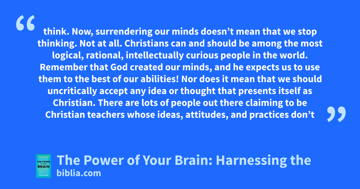 think. Now, surrendering our minds doesn’t mean that we stop thinking. Not at all. Christians can and should be among the most logical, rational, intellectually curious people in the world. Remember that God created our minds, and he expects us to use them to the best of our abilities! Nor does it mean that we should uncritically accept any idea or thought that presents itself as Christian. There are lots of people out there claiming to be Christian teachers whose ideas, attitudes, and practices don’t