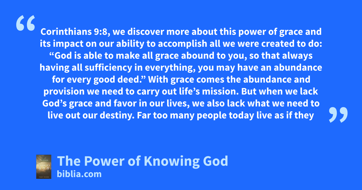 Corinthians 9:8, we discover more about this power of grace and its impact on our ability to accomplish all we were created to do: “God is able to make all grace abound to you, so that always having all sufficiency in everything, you may have an abundance for every good deed.” With grace comes the abundance and provision we need to carry out life’s mission. But when we lack God’s grace and favor in our lives, we also lack what we need to live out our destiny. Far too many people today live as if they