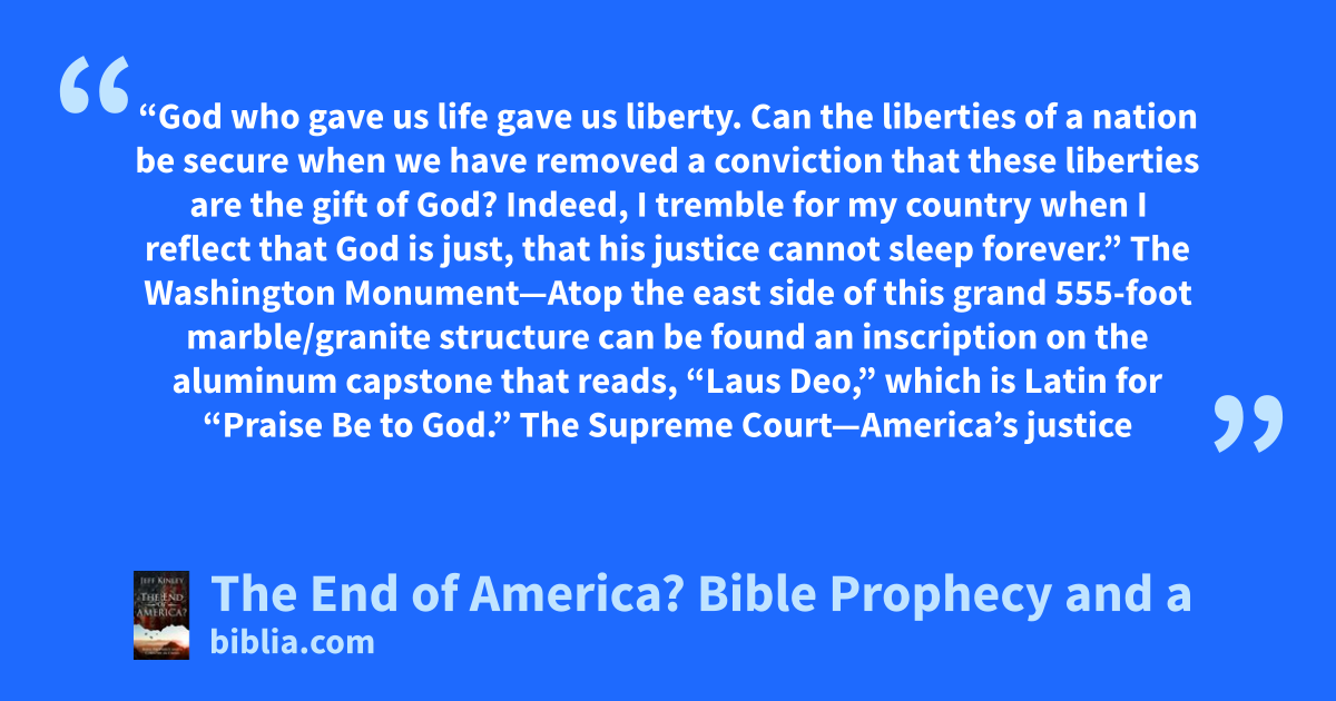 “God who gave us life gave us liberty. Can the liberties of a nation be secure when we have removed a conviction that these liberties are the gift of God? Indeed, I tremble for my country when I reflect that God is just, that his justice cannot sleep forever.” The Washington Monument—Atop the east side of this grand 555-foot marble/granite structure can be found an inscription on the aluminum capstone that reads, “Laus Deo,” which is Latin for “Praise Be to God.” The Supreme Court—America’s justice