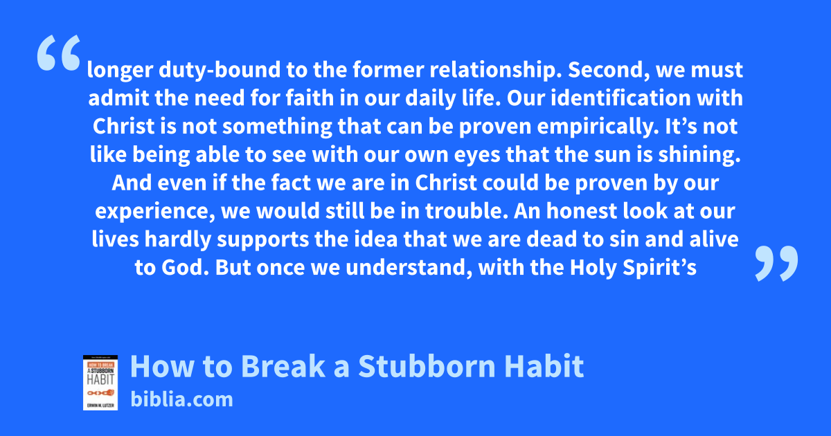 longer duty-bound to the former relationship. Second, we must admit the need for faith in our daily life. Our identification with Christ is not something that can be proven empirically. It’s not like being able to see with our own eyes that the sun is shining. And even if the fact we are in Christ could be proven by our experience, we would still be in trouble. An honest look at our lives hardly supports the idea that we are dead to sin and alive to God. But once we understand, with the Holy Spirit’s
