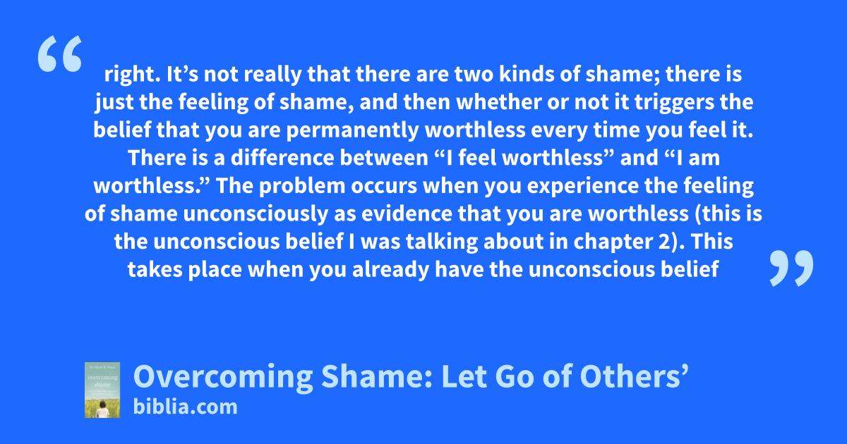 right. It’s not really that there are two kinds of shame; there is just the feeling of shame, and then whether or not it triggers the belief that you are permanently worthless every time you feel it. There is a difference between “I feel worthless” and “I am worthless.” The problem occurs when you experience the feeling of shame unconsciously as evidence that you are worthless (this is the unconscious belief I was talking about in chapter 2). This takes place when you already have the unconscious belief
