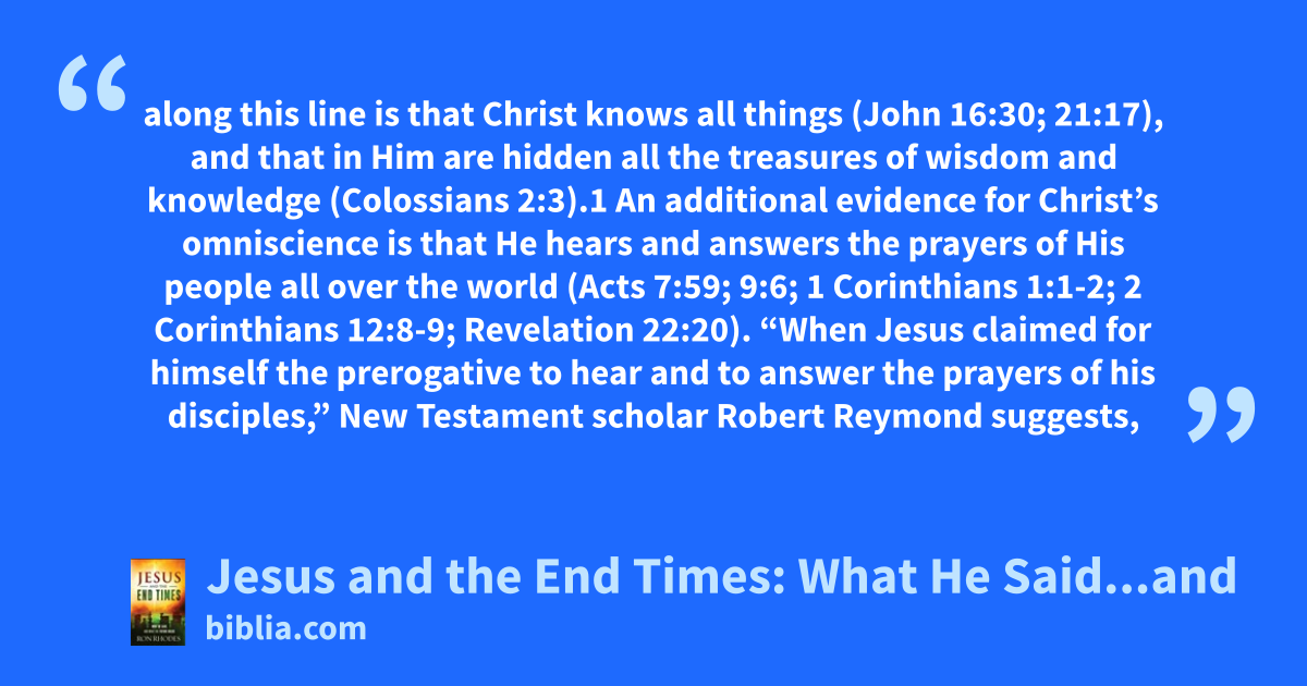 along this line is that Christ knows all things (John 16:30; 21:17), and that in Him are hidden all the treasures of wisdom and knowledge (Colossians 2:3).1 An additional evidence for Christ’s omniscience is that He hears and answers the prayers of His people all over the world (Acts 7:59; 9:6; 1 Corinthians 1:1-2; 2 Corinthians 12:8-9; Revelation 22:20). “When Jesus claimed for himself the prerogative to hear and to answer the prayers of his disciples,” New Testament scholar Robert Reymond suggests,