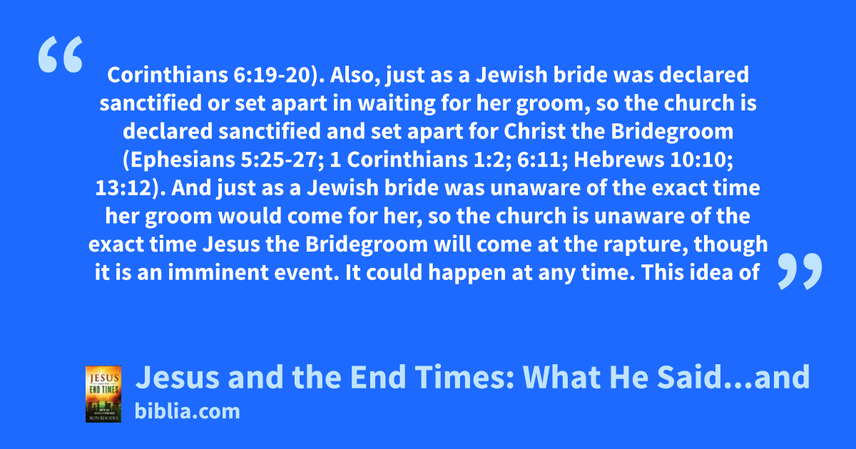 Corinthians 6:19-20). Also, just as a Jewish bride was declared sanctified or set apart in waiting for her groom, so the church is declared sanctified and set apart for Christ the Bridegroom (Ephesians 5:25-27; 1 Corinthians 1:2; 6:11; Hebrews 10:10; 13:12). And just as a Jewish bride was unaware of the exact time her groom would come for her, so the church is unaware of the exact time Jesus the Bridegroom will come at the rapture, though it is an imminent event. It could happen at any time. This idea of