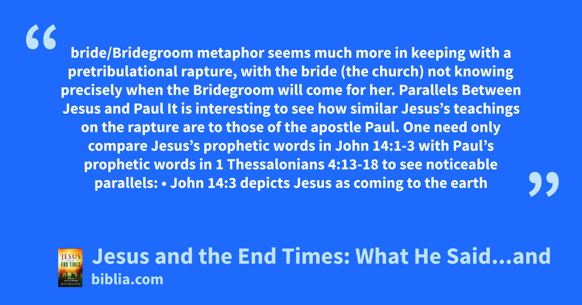 bride/Bridegroom metaphor seems much more in keeping with a pretribulational rapture, with the bride (the church) not knowing precisely when the Bridegroom will come for her. Parallels Between Jesus and Paul It is interesting to see how similar Jesus’s teachings on the rapture are to those of the apostle Paul. One need only compare Jesus’s prophetic words in John 14:1-3 with Paul’s prophetic words in 1 Thessalonians 4:13-18 to see noticeable parallels: • John 14:3 depicts Jesus as coming to the earth