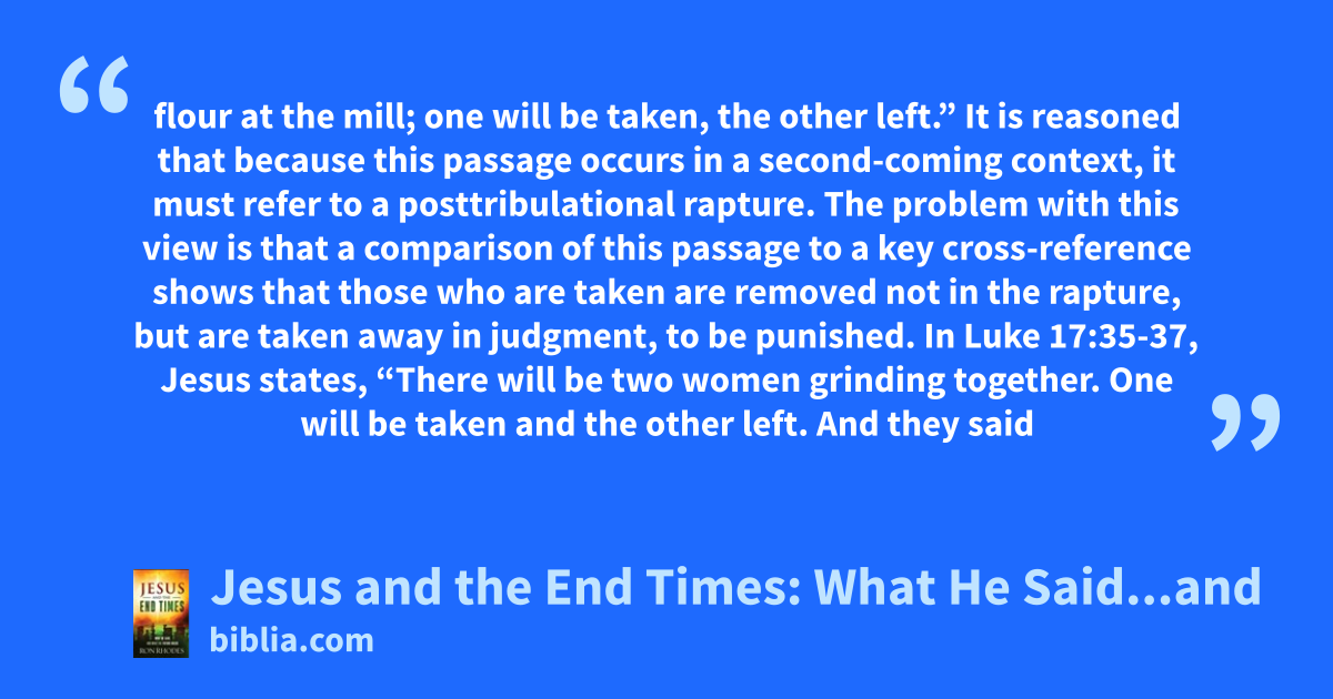 flour at the mill; one will be taken, the other left.” It is reasoned that because this passage occurs in a second-coming context, it must refer to a posttribulational rapture. The problem with this view is that a comparison of this passage to a key cross-reference shows that those who are taken are removed not in the rapture, but are taken away in judgment, to be punished. In Luke 17:35-37, Jesus states, “There will be two women grinding together. One will be taken and the other left. And they said