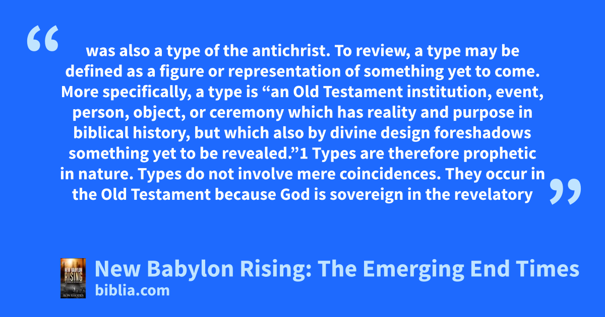 was also a type of the antichrist. To review, a type may be defined as a figure or representation of something yet to come. More specifically, a type is “an Old Testament institution, event, person, object, or ceremony which has reality and purpose in biblical history, but which also by divine design foreshadows something yet to be revealed.”1 Types are therefore prophetic in nature. Types do not involve mere coincidences. They occur in the Old Testament because God is sovereign in the revelatory