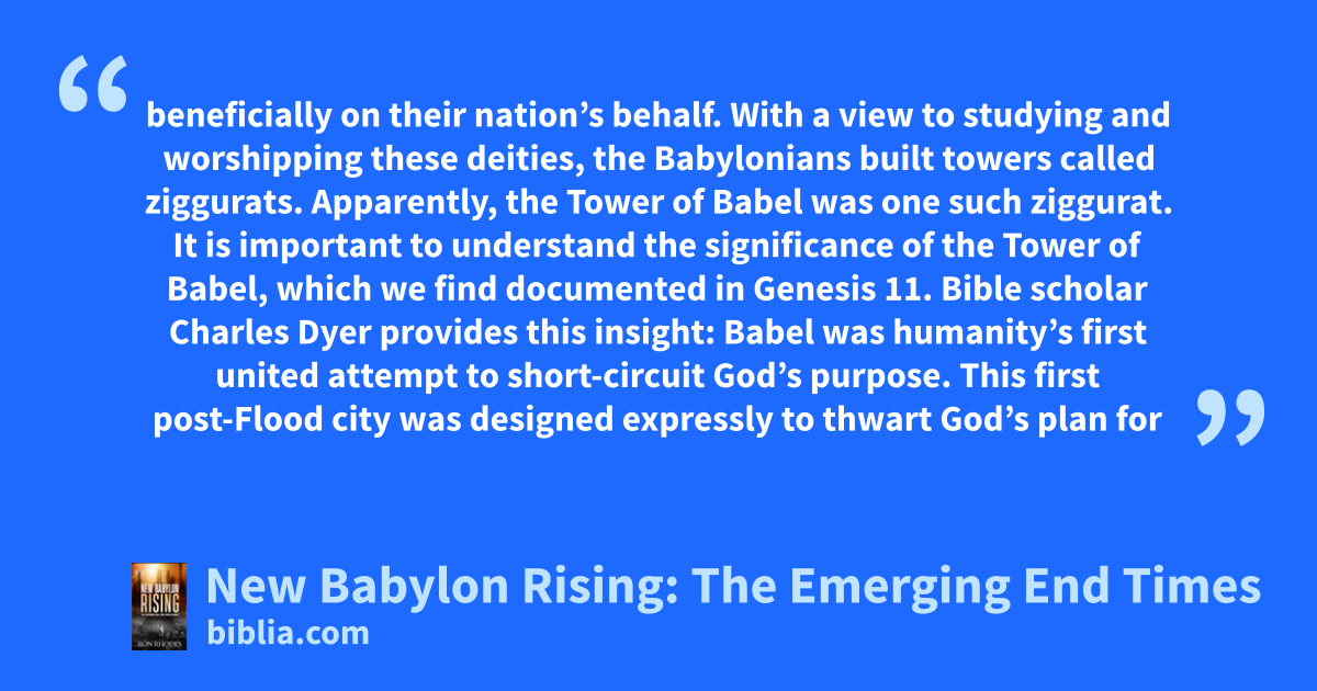 beneficially on their nation’s behalf. With a view to studying and worshipping these deities, the Babylonians built towers called ziggurats. Apparently, the Tower of Babel was one such ziggurat. It is important to understand the significance of the Tower of Babel, which we find documented in Genesis 11. Bible scholar Charles Dyer provides this insight: Babel was humanity’s first united attempt to short-circuit God’s purpose. This first post-Flood city was designed expressly to thwart God’s plan for