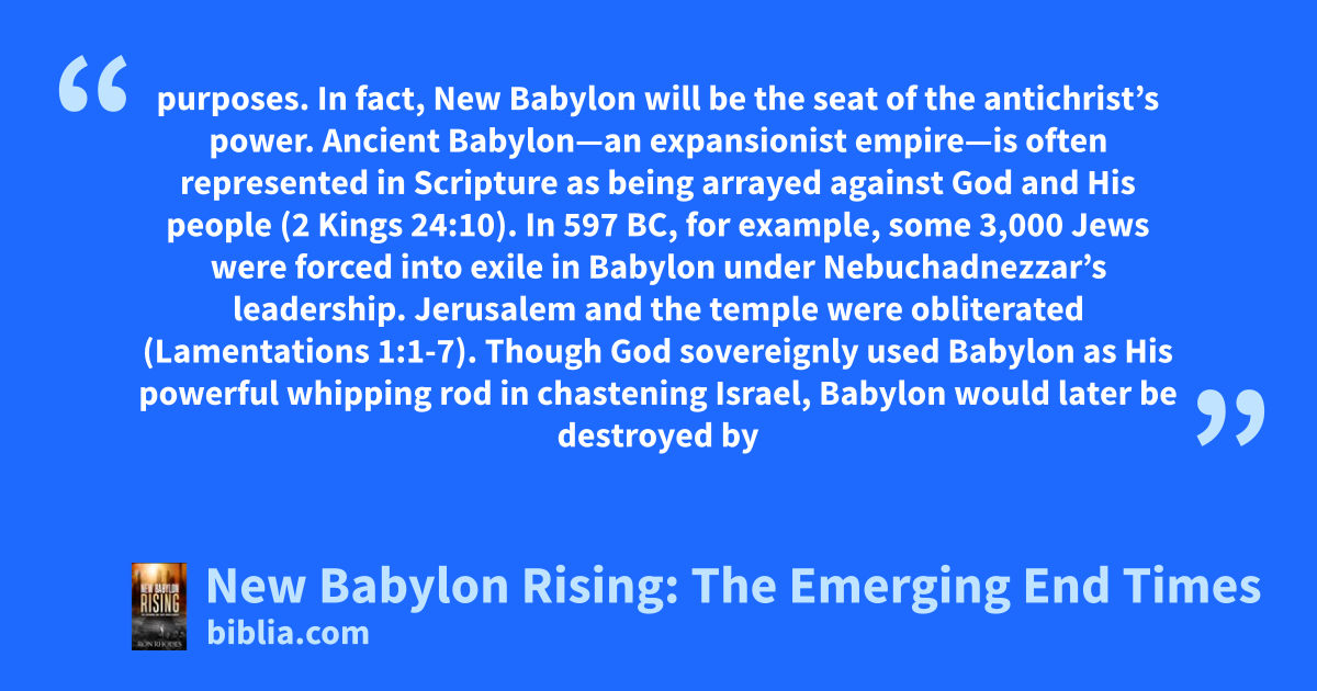 purposes. In fact, New Babylon will be the seat of the antichrist’s power. Ancient Babylon—an expansionist empire—is often represented in Scripture as being arrayed against God and His people (2 Kings 24:10). In 597 BC, for example, some 3,000 Jews were forced into exile in Babylon under Nebuchadnezzar’s leadership. Jerusalem and the temple were obliterated (Lamentations 1:1-7). Though God sovereignly used Babylon as His powerful whipping rod in chastening Israel, Babylon would later be destroyed by