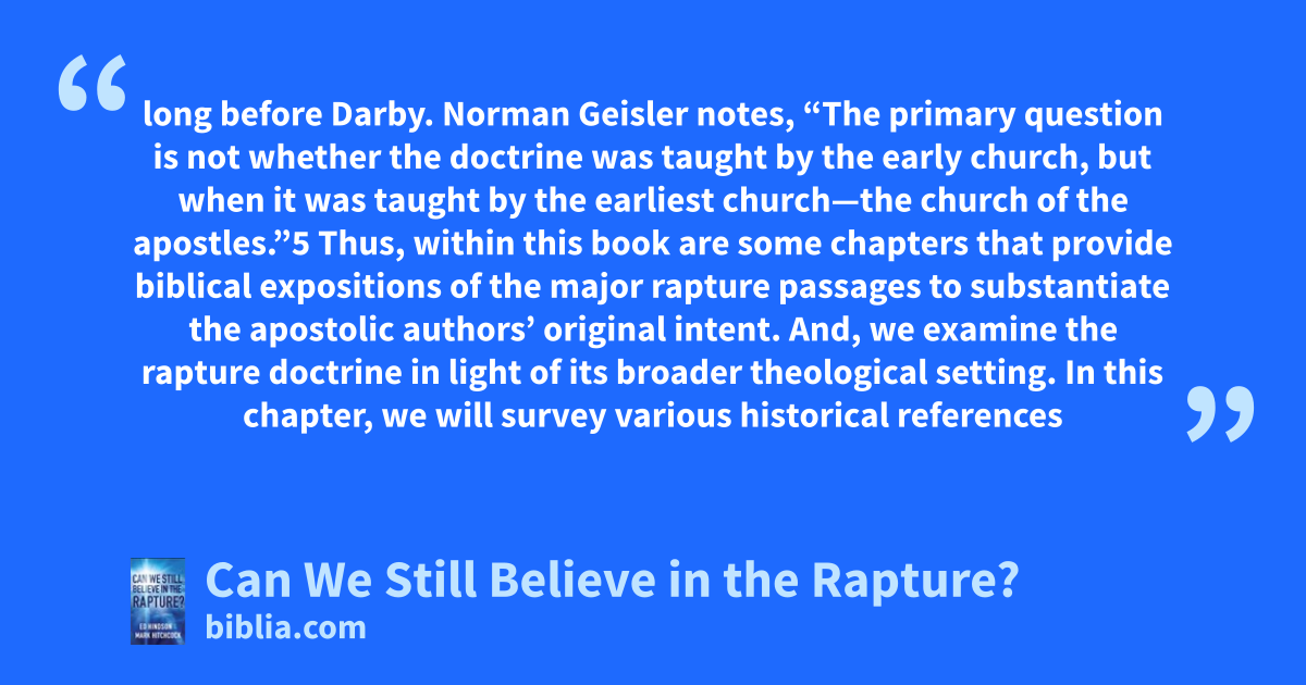 long before Darby. Norman Geisler notes, “The primary question is not whether the doctrine was taught by the early church, but when it was taught by the earliest church—the church of the apostles.”5 Thus, within this book are some chapters that provide biblical expositions of the major rapture passages to substantiate the apostolic authors’ original intent. And, we examine the rapture doctrine in light of its broader theological setting. In this chapter, we will survey various historical references