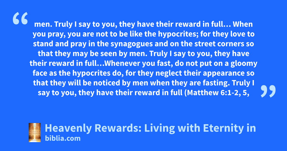men. Truly I say to you, they have their reward in full… When you pray, you are not to be like the hypocrites; for they love to stand and pray in the synagogues and on the street corners so that they may be seen by men. Truly I say to you, they have their reward in full…Whenever you fast, do not put on a gloomy face as the hypocrites do, for they neglect their appearance so that they will be noticed by men when they are fasting. Truly I say to you, they have their reward in full (Matthew 6:1-2, 5,